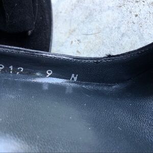 Black suede Peep toes with tortoise shell patent finish 3.5” wedge heels. Bow detail on the vamp. Narrow width.