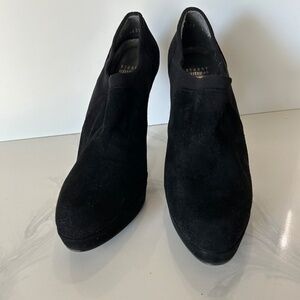 Chic black suede Stuart Weitzman platform booties, size 9.5. Classic silhouette with 4” stiletto heel + 0.5” platform. Worn only once — excellent condition, suede flawless, soles barely touched.