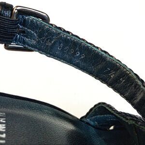Leather upper with woven straps, crisscross detail, functioning buckles, open toes, and 1” platform soles, made in Spain, by Stuart Weitzman.
