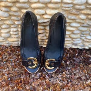 Stuart Weitzman Black Open Toe Buckle Shoes/Mules Block Heel Sandals. Size 7.5. Good Preloved Condition. Leather uppers are in very good condition. Block heels have a few minor scratches. Yellow gold hardware buckle detail in good condition other than minor discoloration to one of the buckle closure holes. Ships from a smoke and pet free home.