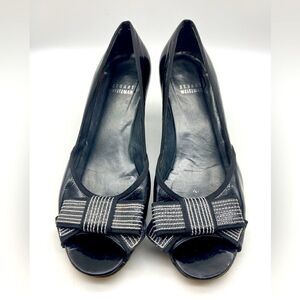 Stuart Weitzman Black/White Striped Bow Black Patent Leather Heels Size 8W