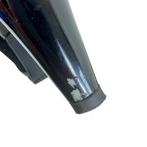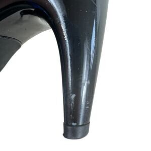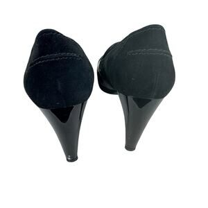 Very good condition, except for wear on heels (pictured). Black suede leather slip on high heel pumps. Patent leather strap across top of foot. Approx. measurements: Length 10.5", heel 3.5". Women's size 7.5.