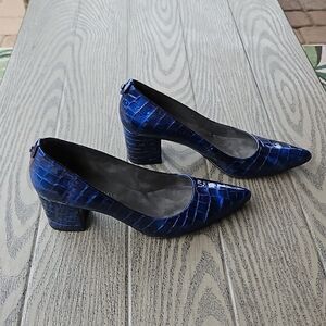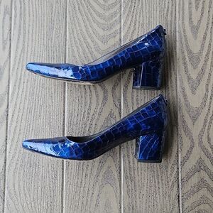 Stuart Weitzman bright blue croc embossed patent block heel pumps.