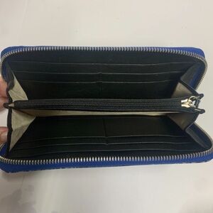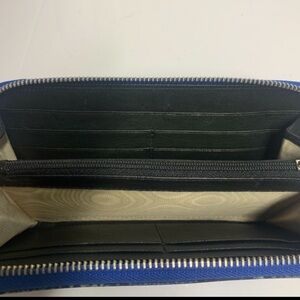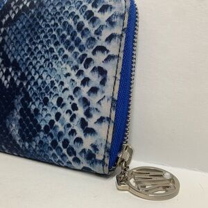 Rare Discontinued Stuart Weitzman zip-around continental wallet in a bold blue python-print fabric with silver-tone round SW logo charm accented by a clear stone. Lightweight yet structured design with full metal zip closure.