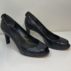 Stuart Weitzman Blue Snake Embossed Leather Peep Toe Heels, Sz 6