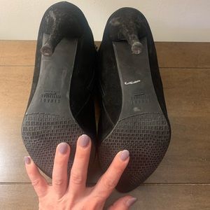 Stuart Weitzman platform bootie in black suede size 9. Worn with minimal show to the foot and heel pads. Heels slightly scuffed but in good condition!