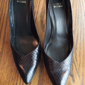 Stunning profile on these Stuart Weitzman bronze pumps. Python or snakeskin embossing. Stiletto heels. I don't know the name for the v shape of the shoe vamp, but I love it. GUC with slight wrinkle at toe bed and some wear to leather soles as shown in photos. Interiors/insoles in EUC.