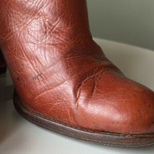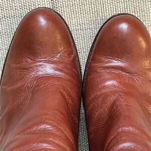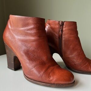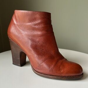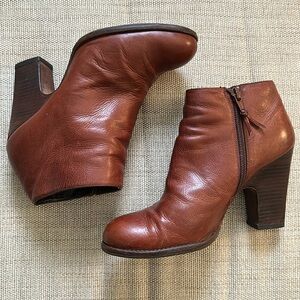 Elegant brown leather ankle boots. Features a sturdy block heel. Perfect for versatile styling.