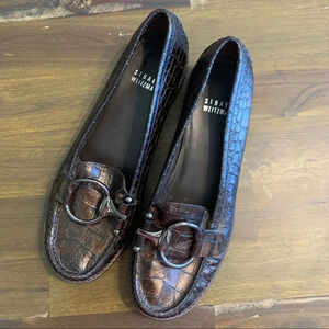 Stuart Weitzman Brown Croc Embossed Leather Loafers Buckle Slip On 6 Calf