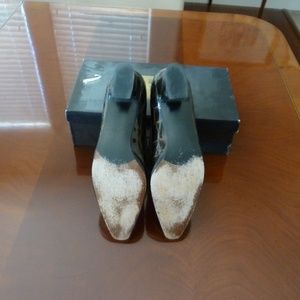 Stuart Weitzman Bently Brown Croc pumps, Calf. sz 8.5 m. 1 1.5" heel. Very comfortable. One small nick on the exterior right heel shown in pic #5. Otherwise excellent. Interior measures 10 1/4" l x 2 7/8"w