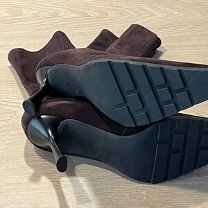 These Stuart Weitzman heeled boots showcase a sleek and sophisticated design in a rich brown suede hue. The medium-height heel offers an elegant lift, while the luxurious suede texture adds a touch of refinement to any outfit. Perfect for elevating your style with a classic and timeless appeal.