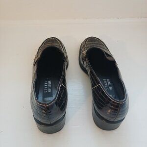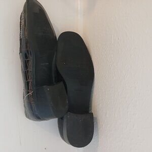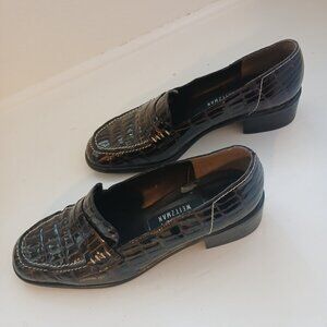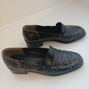 Stuart Weitzman Brown Patent Croc Stitch Leather Penny Loafer Heels
