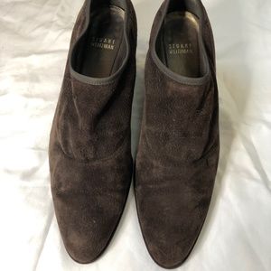 Stuart Weitzman booties. Brown Suede. 2” heel. Minimal wear on the soles but some rubbing on the heels. Size not visible so length of approx. 10” displayed.