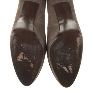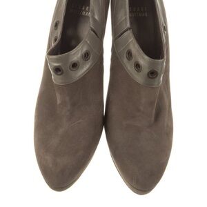 These Stuart Weitzman ankle boots are crafted from premium brown suede, featuring a classic semi-pointed toe design. The boots exhibit a sophisticated style, perfect for both formal and casual occasions. These booties are in good preowned condition, and remain elegant and durable for your enjoyment.