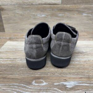 Experience everyday comfort with these Stuart Weitzman brown suede loafers, perfect for your casual outings. The shoes feature a smooth leather lining that envelops your feet in luxury, while the durable rubber outsole provides reliable traction. With a women's size 6 fit, these loafers are designed to offer both style and ease. The loafers boast a classic top zip closure, ensuring a secure and adjustable fit. The rich brown hue complements a variety of outfits, making these shoes a versatile addition to your wardrobe. Whether paired with jeans or a casual dress, these Stuart Weitzman loafers are sure to elevate your look.
