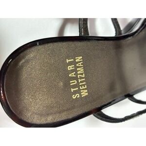 Keywords: Stuart Weitzman, Wedge sandals, Brown sandals, Patent leather, Strappy sandals, Tortoise shell, Designer shoes, Women's shoes, Formal shoes, Evening wear, Comfortable heels, Elegant sandals, Dark Brown, Wedges