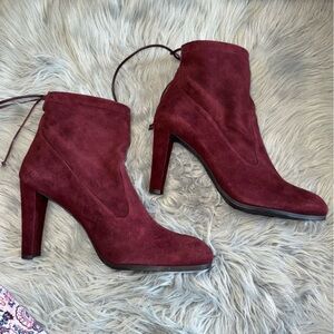 Stuart Weitzman Burgundy Suede Glove Tie Back Round Toe Heeled Ankle Bootie 12