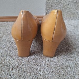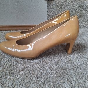 Stuart Weitzman Camel Nude Patent Leather Heels Almond Toe Womens Size 10M Heel height 2.5" measurements are approximate