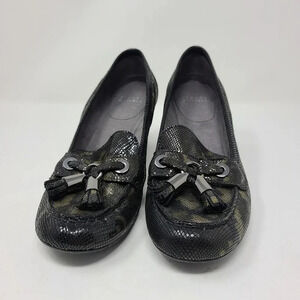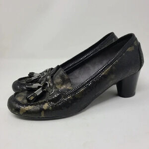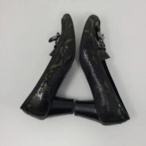 Stuart Weitzman camouflage print heeled tassel loafers. Excellent preowned condition.