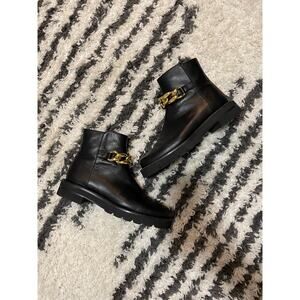 Stuart Weitzman Mila Chain Lift Bootie. Leather lug-sole ankle boots are topped with a polished goldtone chain across the vamp, to add edge to these everyday essentials. Comes with original box.