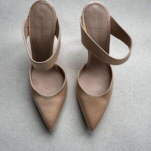 These Stuart Weitzman heels feature a sleek pointed-toe and a chic cream color, perfect for formal occasions. Crafted with a luxurious finish, they exude timeless sophistication.