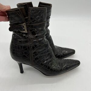 Stuart Weitzman Chocolate Polished Crocodile Patent Zip Bootie With Buckle 6.5B.