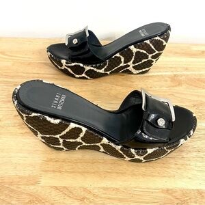 Stuart Weitzman "Clipper" Giraffe Print Platform Slip On Buckle Wedge Sandals, Women’s Size 7.5