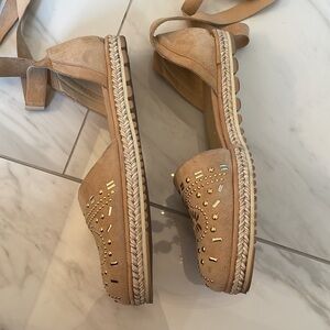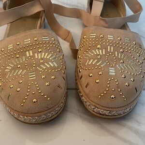 The perfect summer shoe and oh so comfortable!! Made with leather and suede, has beautiful gold detailed embellishments. Only worn 3-4 times. Size 7.5, I'm usually a 7 so I had to size up a bit. Normal wear throughout. The store sticker was very hard to get off so there's some marks from that (black marks on inside are not dirt). Added a few additional photos as I moved and they show a bit more wear now. See closeups. 1 bead missing in the front and some glue spots/dirt on the sides. Just want to point out what I can.