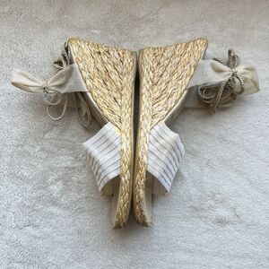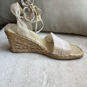 Stuart Weitzman Cream Organza Mesh Wedge Heel Sandals Women 7 Ankle Strap Laces