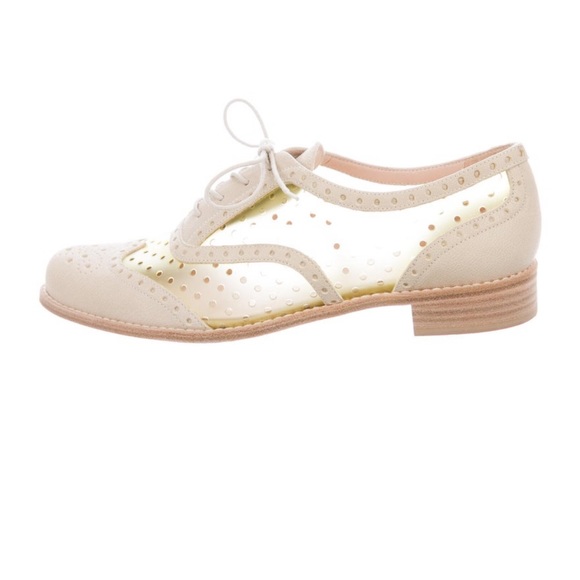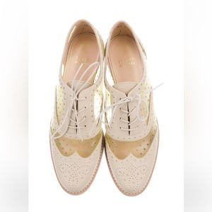 Adorable cream colored oxfords with gold accents and see through panels along the sides. Perforated design. Lace-up style. Love these but they don’t fit me right.
