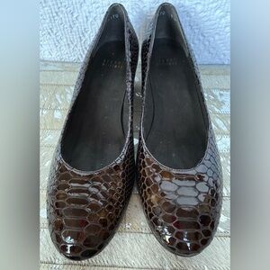 Classic Stuart Weitzman wedge pumps crafted in glossy brown croc-embossed leather. Timeless round-toe silhouette with a comfortable low wedge heel, perfect for everyday wear, work, or travel. Elegant neutral with subtle texture that elevates both casual and dress looks.
