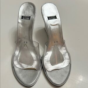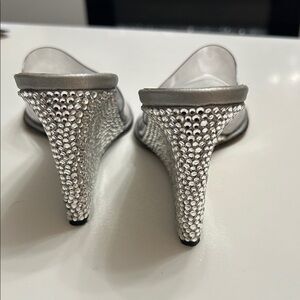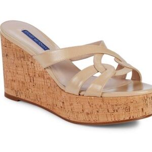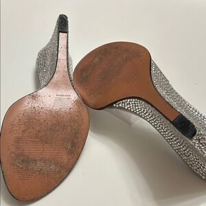 Shimmer with these Stuart Weitzman wedges. Crystal details add sparkle. Sleek and stylish for any event. Size 8