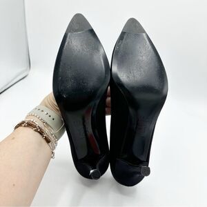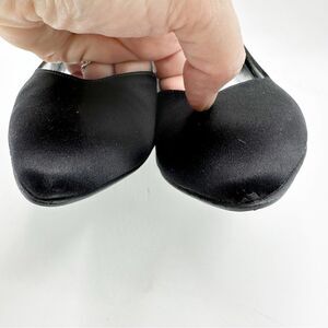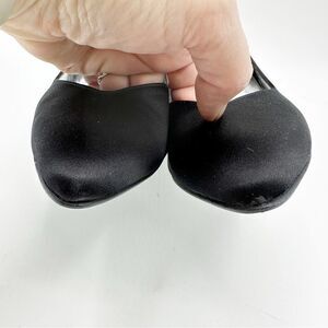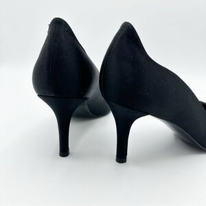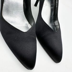 Curved sides give a feminine vibe to these pointy toe designer black satin evening pumps. A go to style for all your formal, evening, cocktails and holiday events.