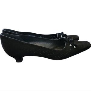 Step out in style with these elegant black women's heels. Perfect for any occasion, these shoes offer both extreme comfort and sophistication. These shoes have only been worn once and are in fantastic condition. Beautiful perforated suede and metallic details on the bows add the perfect touch.