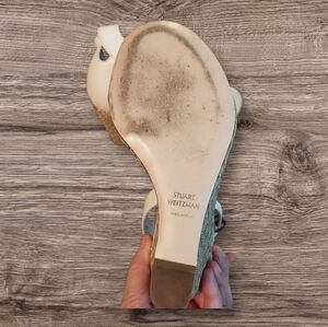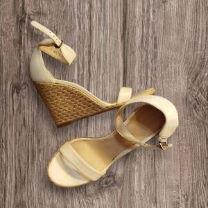 Stuart Weitzman size 7.M, Leather Step out in style with these elegant cream and gold wedge sandals, stunning . Perfect for any occasion, these shoes offer both comfort and sophistication.