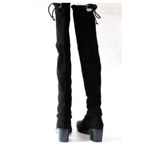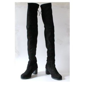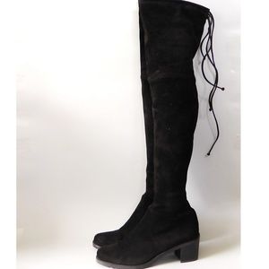 A chunky block heel grounds a soaring over-the-knee boot crafted in Spain from soft, gorgeous Italian suede--while a slim tie tops it all off.