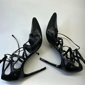 Stuart Weitzman Excite Pointy Toe Lace Up Pumps Caged Heels Patent Leather Black 7