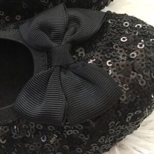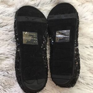 This ballerina loves to shine. Comfort meets funky sequined fashion. Black ballerina elastic slip on shoe, black sequins and complimentary black bows. Never worn condition with small stain on lining. Offers always warmly received, bundle offers deeply discounted. Size 4. Great for girls or women. Stuart Weitzman sequin flat.
