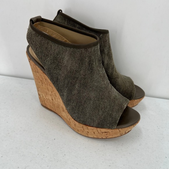 Keywords: Stuart Weitzman heels, olive green shoes, denim wedges, peep toe heels, slingback shoes, cork wedges, summer shoes, casual heels, designer heels, women's footwear, fashion shoes