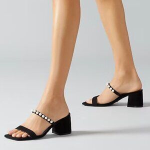 These slip on shoes have a beautiful wide 60-mm block heel, open square toe, PEARLS, and are made of soft black suede.