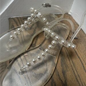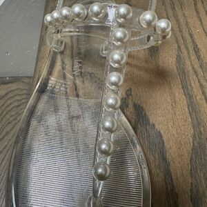 These Stuart Weitzman sandals feature a chic T-strap design adorned with pearl-like beads, offering a sophisticated touch to any outfit. The clear jelly and flat sole make them perfect for both formal occasions and casual beach outings. Experience comfort and elegance with every step in these stylish sandals. Worn once - they are perfect!!!#jellysandals #stuartweitzman