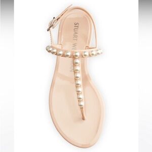 “Stuart Weitzman Goldie Pearly Stud Jelly Sandals Color: Nude/Beige Stuart Weitzman "Goldie" jelly sandals in PVC with pearly stud accent. 0.2" flat heel. T-strap vamp. Adjustable ankle strap. Rubber sole. Made in Spain.”