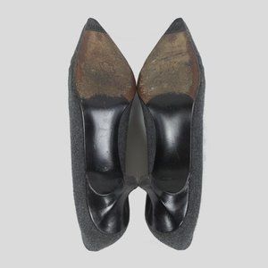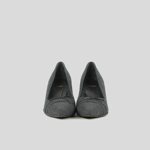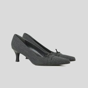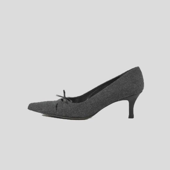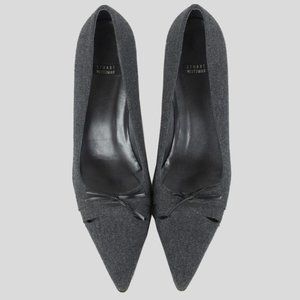 Stuart Weitzman grey flannel kitten heel, closed-toe pumps with black bow design and wooden heel.