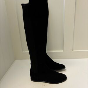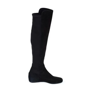 Stuart Weitzman hidden wedge knee high boots with pull on style, round toe, and concealed 2" heel.