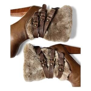 These stunning Stuart Weitzman boots are made of rich brown leather with ultra-soft faux fur trim, they feature a chic trio of adjustable brass tone buckle straps and a stacked wooden heel. Perfect for the boho/y2k/faux fur lover, wish they were my size!!