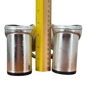 Features: Metallic silver finish, open toe, block heel, sleek design perfect for evening events, luxe party style