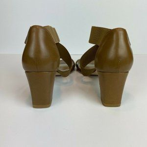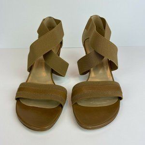 Light brown stretchy elastic criss cross upper with leather contrast. Slip on style. Chunky block heel. Open toe. Leather backs, lining and sole.