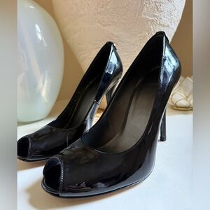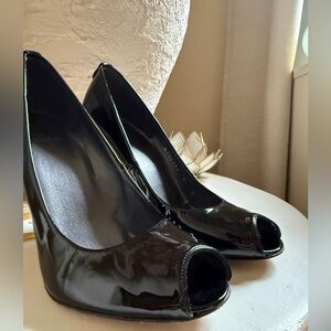 Stuart Weitzman black patent leather peep toe heel pumps.