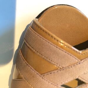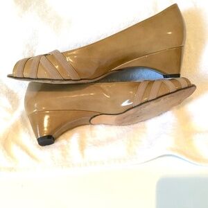 High quality shoe in neutral patent leather, criss cross front, peep toe, low wedge heel, tan, narrow width, no box
