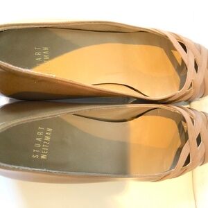Stuart Weitzman Heels Wedge Peep Toe Tan Patent Leather Low Heel Narrow (9.5 N)